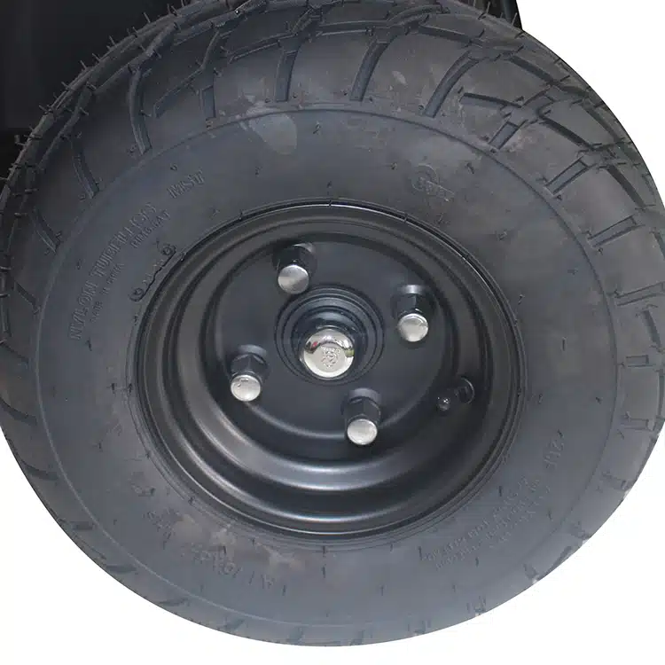 De Forto rijdt op 16×8-7 vacuum banden (tubeless) — brede, luchtbandloze banden die zorgen voor maximale grip, minder kans op lekrijden en een soepele rit, zelfs op oneffen wegen. Deze banden dragen niet alleen bij aan het rijcomfort, maar ook aan de stoere uitstraling van het voertuig.